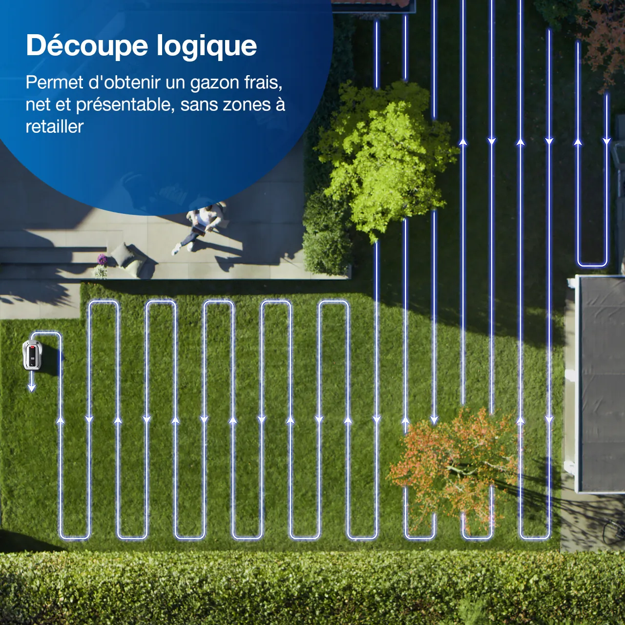 • Délimitation sans fil : Les limites physiques des fils sont remplacées par des signaux de balise; ainsi, tous les réglages de limites peuvent être effectués en un seul clic via l’application.